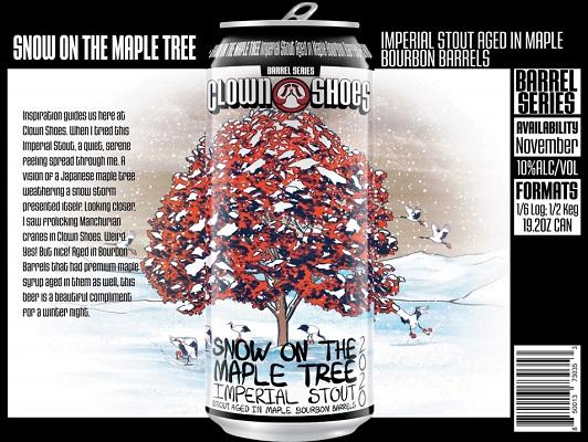 - Clown Shoes Snow on the Maple Tree 2020 1/12/19.2oz “Stovepipe” CAN – Imperial Stout Aged in Maple Bourbon Barrels. 10% ABV.
