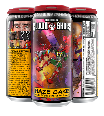 - Clown Shoes Haze Cake 6/4/16oz CANS – Hazy Double IPA with Mosaic, Citra, and Centennial hops, Honey, and 2-row malts, wheat. 9% ABV.