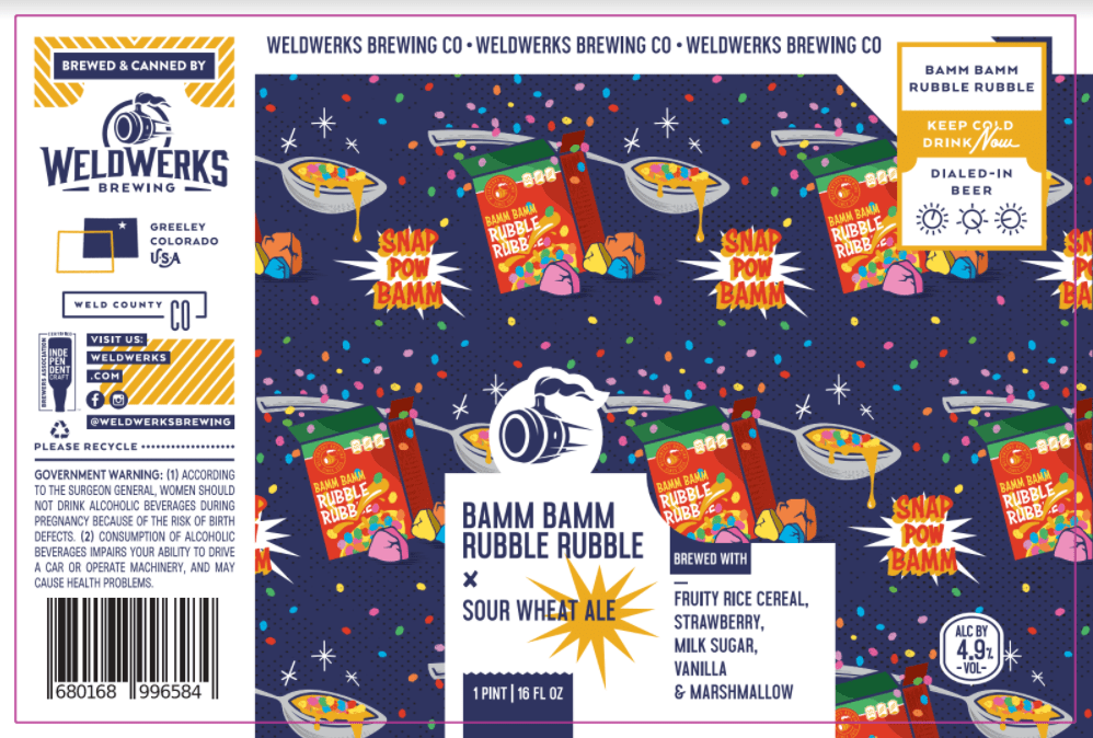 Bamm Bamm Rubble Rubble Sour wheat ale Sour Wheat Ale brewed with Fruity Pebbles Cereal, Strawberry, Milk Sugar, Vanilla + Marshmallow.