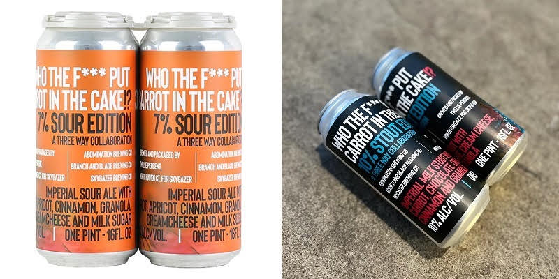 - ABOMINATION / SKYGAZER / BRACH AND BLADE Who the F*** Put Carrot In the Cake!? (Sour + Stout Edition) 6/4/16oz CANS – Note that this case will contain 1/2 Stout Cans & Half Sour Cans of this beer – A three way collaboration – Imperial Stout Ale brewed with Carrot, Chocolate, Cream Cheese, Cinnamon, & Granola – 10% ABV – CT + Imperial Sour Ale brewed with Carrot, Apricot, Cinnamon, Granola, Cream Cheese, & Milk Sugar – 7% ABV – CT