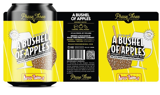 PHASE THREE AFFY TAPPLE Collab. BUSHEL 6/4/12oz CANS – Peanut Caramel Apple Golden Ale. Balanced fresh, tart apple with sweet caramel and roasted peanuts. A caramel apple in a golden ale package. 6% ABV – IL