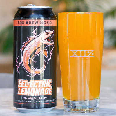 - Tox Brewing Eel-Ectric Peach Lemonade 6/4/16oz CANS – Light and Refreshing Sour with Peach, Fresh Lemon and a hint of Lemon Zest. Great Patio Refresher! 4.5% ABV – CT
