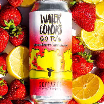 - Skygazer Watercolors Go To’s Strawberry Lemonade 6/4/16oz CANS – Smoothie-Style Sour Ale brewed with Strawberry, Lemon, & Milk Sugar. There’s nothing quite like lemonade on a beautiful summer day! We think strawberry lemonade is even better! 5% ABV- CT
