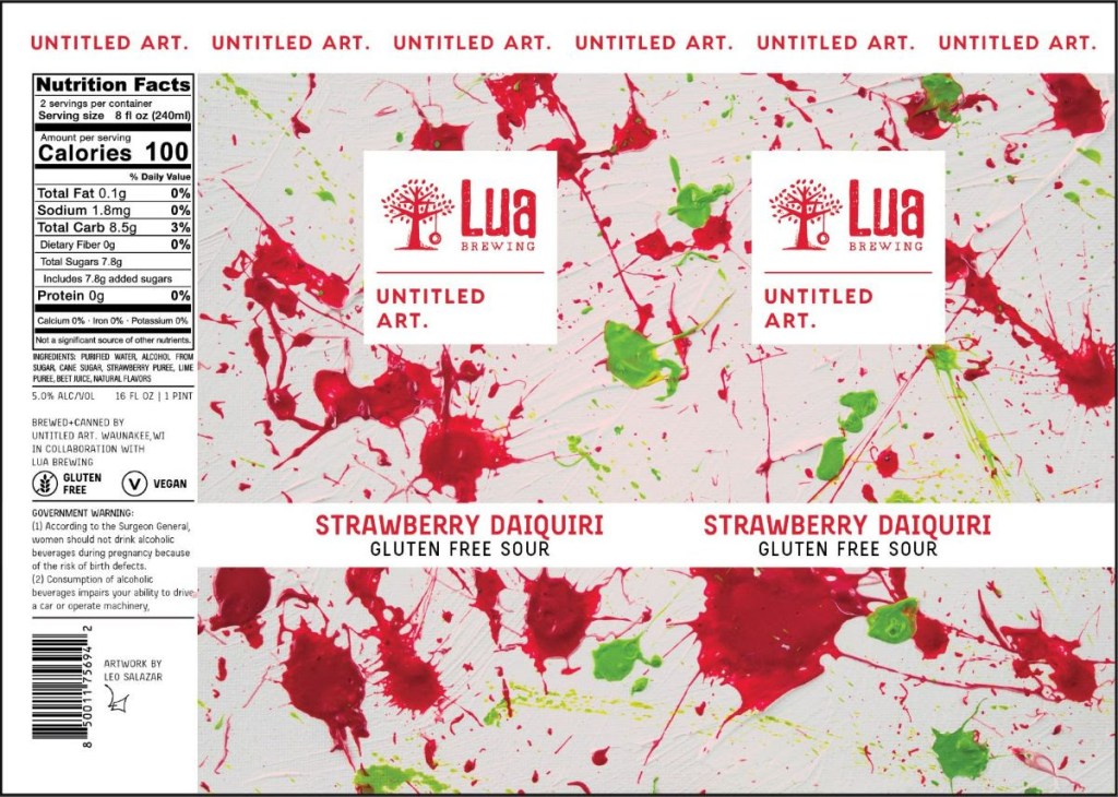 Strawberry Daiquiri – GLUTEN FREE Sour Collaboration with LUA brewing This new beer was brewed at Untitled Art in collaboration with LUA brewing of Des Moines, IA. It’s made with Strawberry puree, lime puree, beet juice, cane sugar and water. It’s also Gluten Free and Vegan Friendly.
