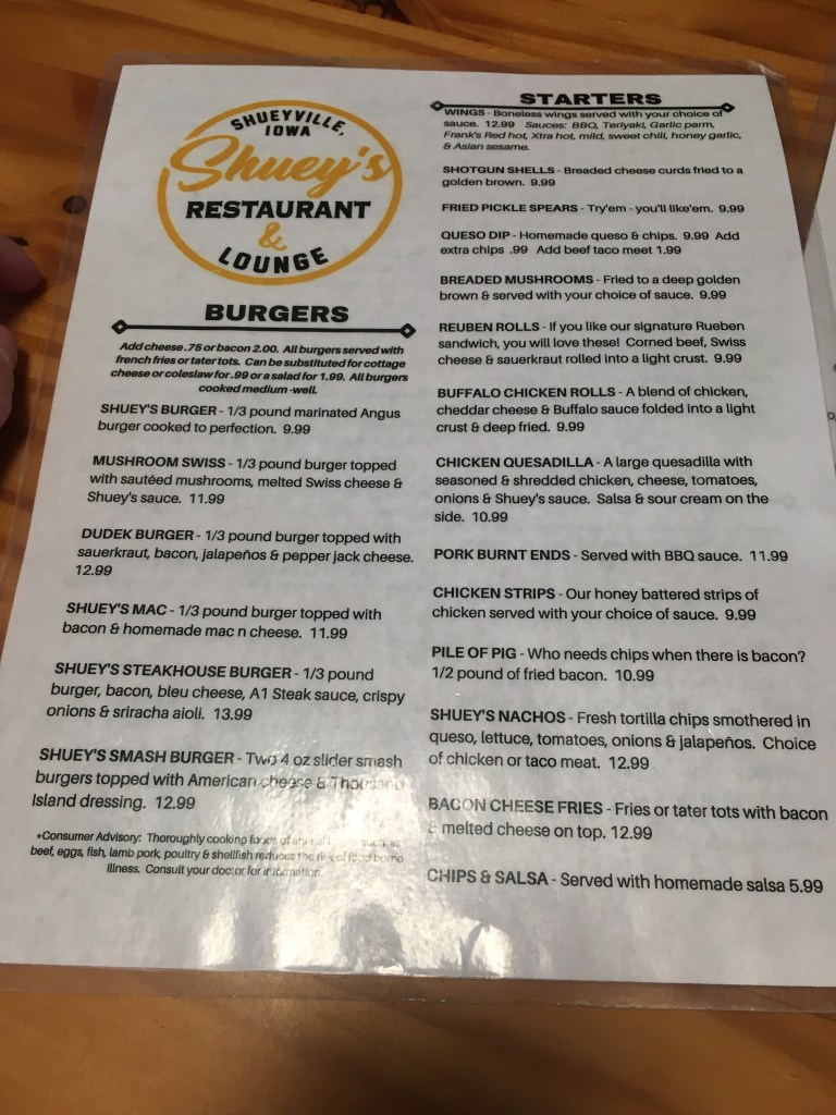 This past weekend I had some time to hang out with my oldest and I asked him where/what he wanted to eat. He simply responded, “Bar food”. So after a quick trip to Big Grove in Solon we headed to Shueyville, about 10-15 minutes from Solon, and hit up Shuey’s Restaurant and Lounge.