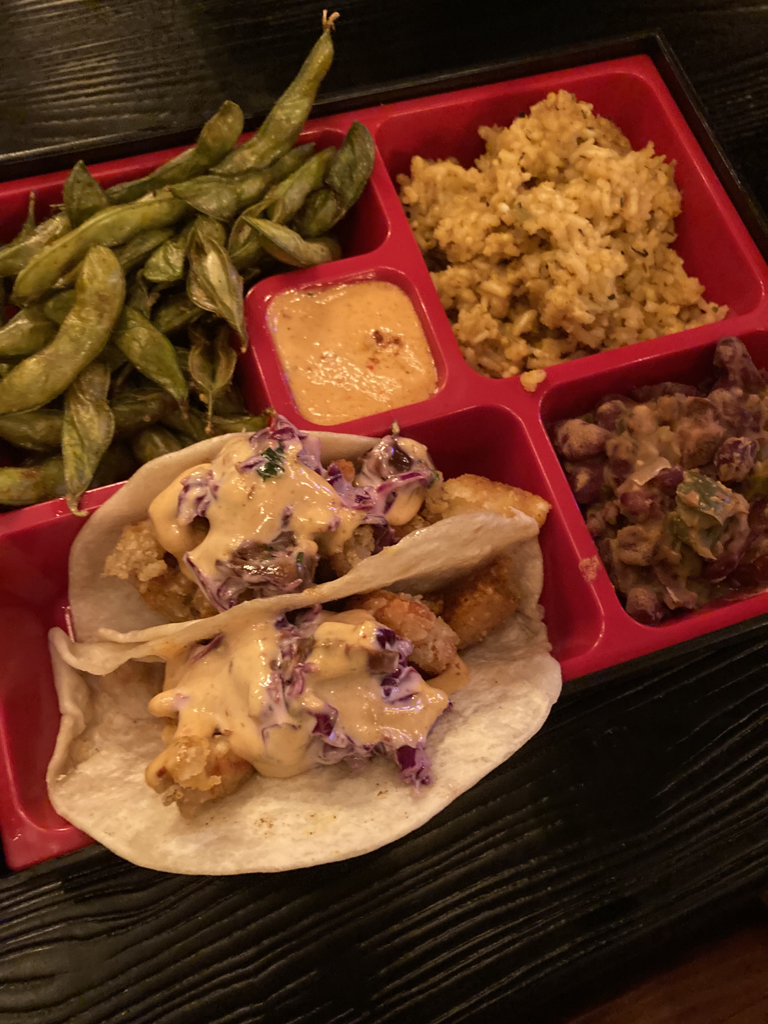 The flavor on every single dish was out of this world. The fish tacos were perfectly cooked….crunchy and a delicious batter. Your taco orders of two come in a bento style serving box accompanied by delicious refried beans, rice, and fried edamame. I’ll get the fish tacos every time! Pastor were just as good…fresh pineapple pico and perfectly cooked pork. I was lucky enough to get a small bite of the fried crawfish tacos as my son isn’t exactly the best at sharing meals, especially when they taste as good as this.