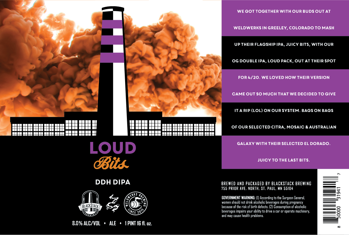 LOUDBITS – Weldwerks/Blackstack Collab (juicy bits meets loud pack) 8% ABV An 8% DDH Double New England IPA, brewed in collaboration with WeldWerks Brewing. It is a combined recipe of their famous Juicy Bits and our yearly favorite Loud Pack. It features BlackStack’s hand selected Citra, Mosaic and Australian Galaxy, in combination with El Dorado hops selected by WeldWerks.