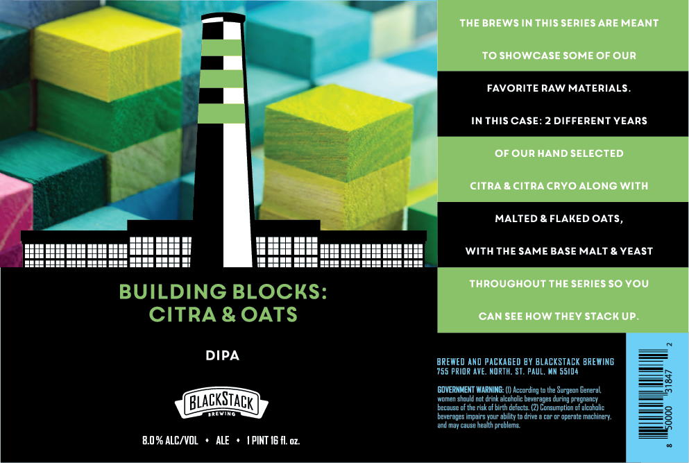Building Blocks Citra & Oats DBL IPA 8% ABV The Brews in this series are meant to showcase some of our favorite raw materials. In this case 2 different years of our hand selected Citra & Citra Cryo hops along with Malted & flaked oats, with the same base malt & yeast throughout the series so you can see how they stack up!