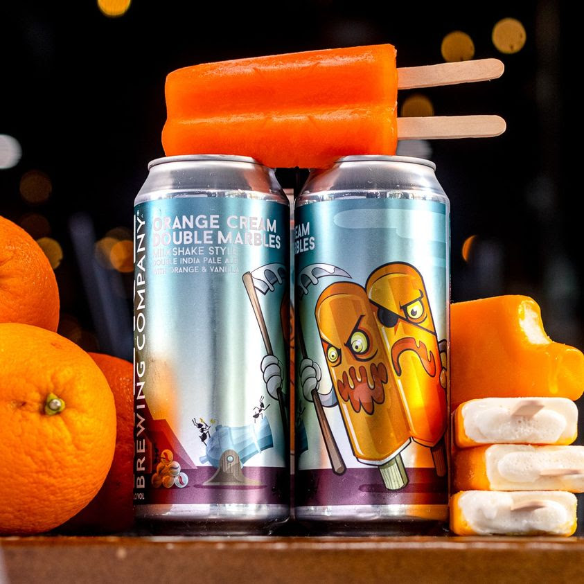 Orange Cream Dbl Marbles Milkshake IPA Milkshake Style Double India Pale Ale with Orange and Vanilla Loads of ripe, juicy oranges emanate from the can and fill the air with its bright, citrusy aroma. A copious addition of both Amarillo and Citra hops add some tropical complexity that is rounded out with sweet vanilla and milk sugar for a dreamy creamsicle tang. (8% ABV)