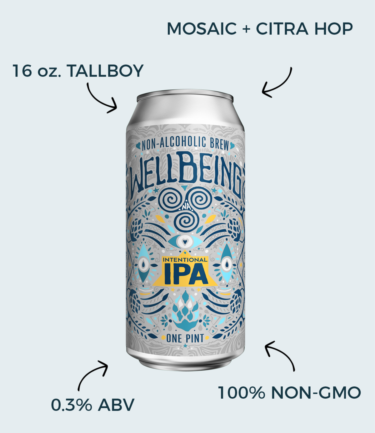Intentional IPA Intentional IPA delivers the distinctly and delightfully bitter characteristics of Mosaic and Citra hops, refreshingly punctuated with pineapple and peach notes. This sessionable IPA offers a full-flavored, alcohol-free experience for any intentional occasion. Intentionally brewed to savor the moment, acknowledge the things that bring us gratitude, and inspire kindness to #RaiseWellbeing.