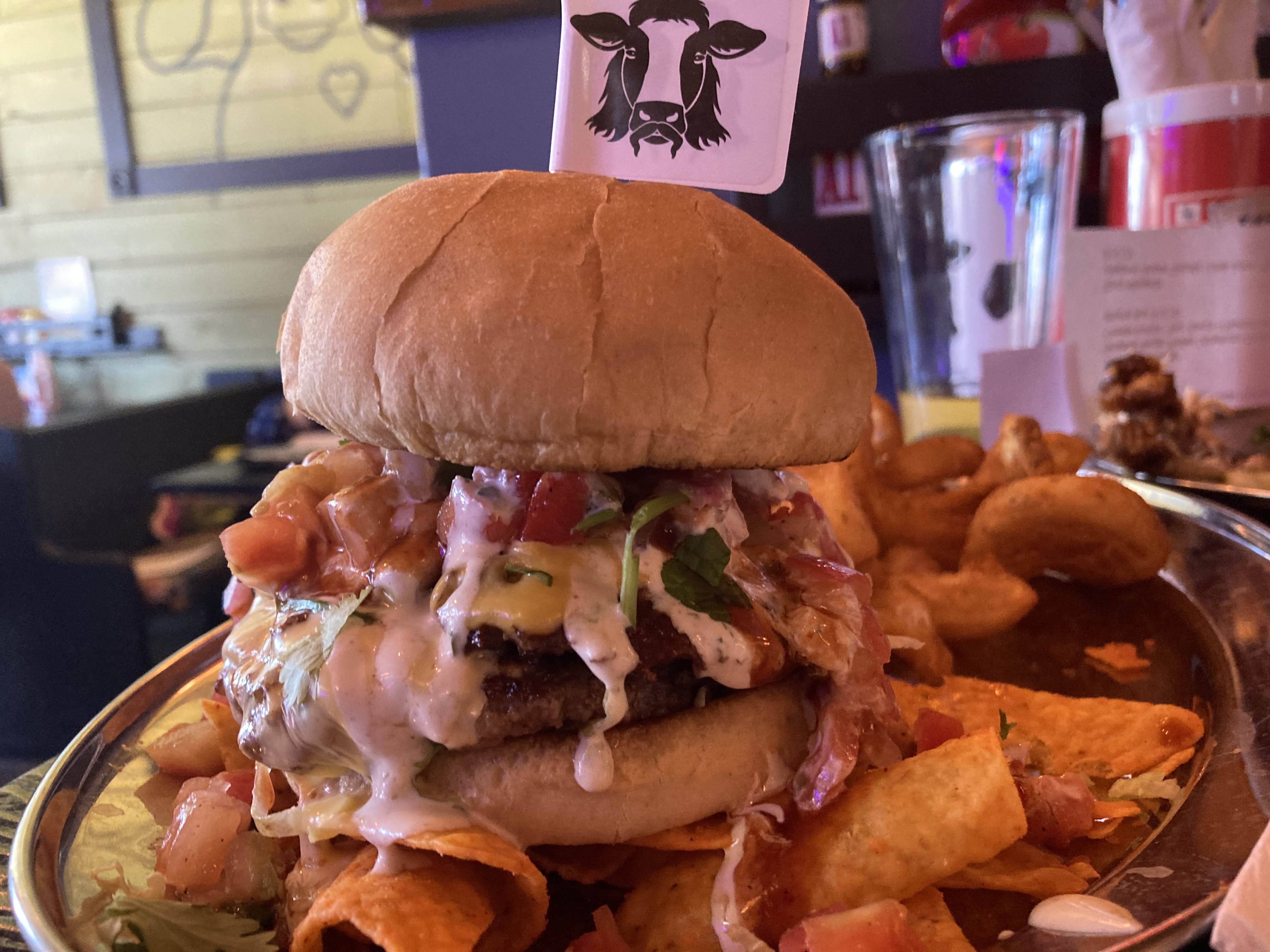 It’s always fun when you are traveling through a big town or city and see a random restaurant/bar/tavern pop up on a neighborhood corner far seemingly far removed from the chains that have taken over main drag USA. Heading down a street in the Oak Hill Jackson neighborhood in downtown Cedar Rapids and seeing a lovely sign of a cow with a halo over its head was a welcomed sight! Sacred Cow Tavern was calling my name and I couldn’t wait to answer!