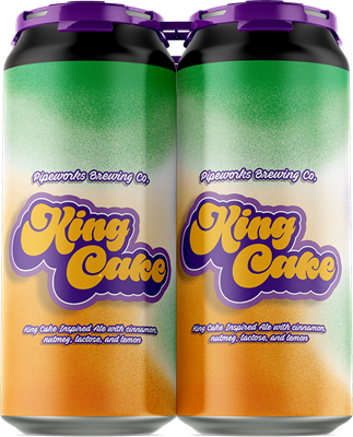 PIPEWORKS King Cake 6/4/16oz CANS – King Cake Inspired Ale with Cinnamon, Nutmeg, Lactose and Lemon. YUM Factor 8 out of 5 Stars! 8.1% ABV – IL
