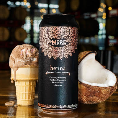 MORE BREWING Henna: Coconut Double Rainbow 6/4/16oz CANS – Decadent Imperial Stout loaded with Strawberry, Vanilla, Chocolate, and Coconut, a rich, dessert-like pour. 14% ABV – IL