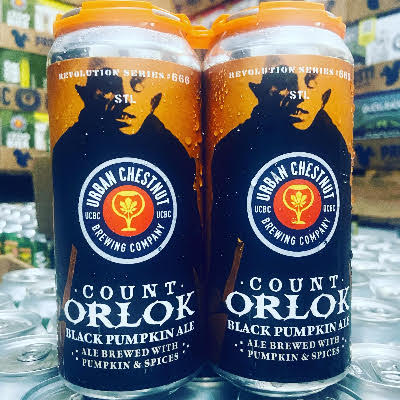 URBAN CHESTNUT COUNT ORLOK 6/4/16oz CANS – Black Pumpkin Wheat Ale. “Nosferatu (Bird of Death), aka Count Orlok was The German Count Dracula. He was a blood-sucking vampire…but being German he must’ve enjoyed beer too, right? We believe it is so and thus have created a Black Pumpkin Wheat Ale in his honor…a ‘bier noir’ if you will.” 5.4% ABV – MO