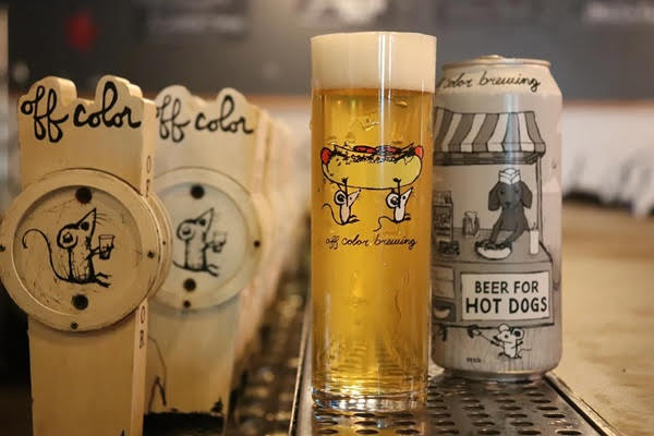 Off Color Beer for Hot Dogs 6/4/16oz CANS – Kölsch inspired beer, light, clear and crisp beer will cut right through the rich, fattiness of a hot dog. A sweet, fruity essence from Applewood dried malt and a slightly spicy hop note from traditional German hops adds depth of flavor. 4.5% ABV – IL