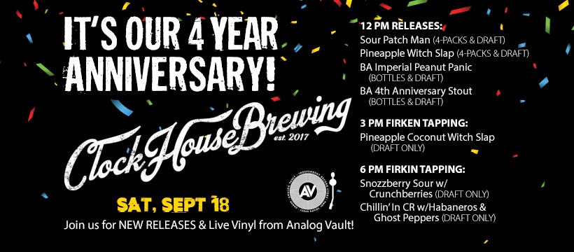 Clock House Brewing in Cedar Rapids will be celebrating their 4 year anniversary on September 18th with a ton of beers being tapped including Pineapple Witch Slap and their 4 year anniversary stout! Here’s more from Clock House on this beer filled day!