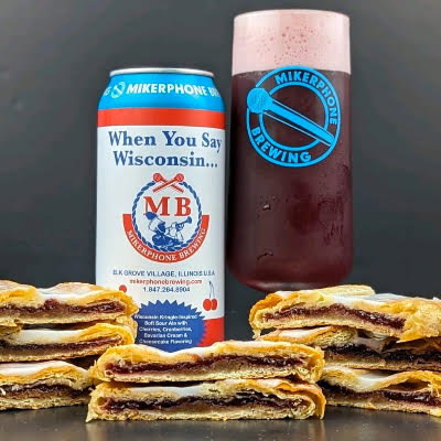 - Mikerphone Brewing – When You Say Wisconsin – 6/4/16oz CANS – Wisconsin Kringle-Inspired Berliner Weisse with Cherries, Cranberries, Bavarian Cream, and Cream Cheese Flavoring. 6% ABV – IL